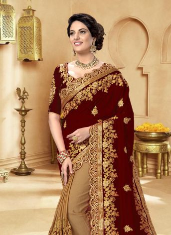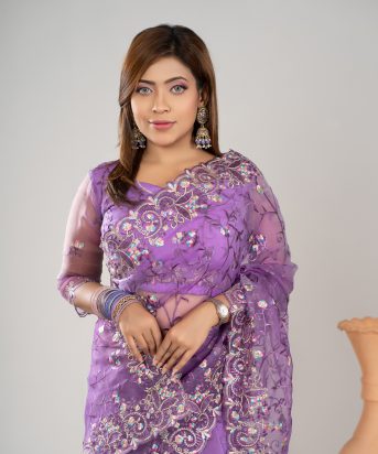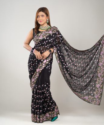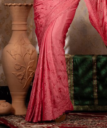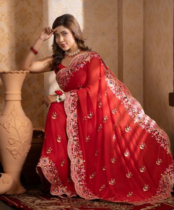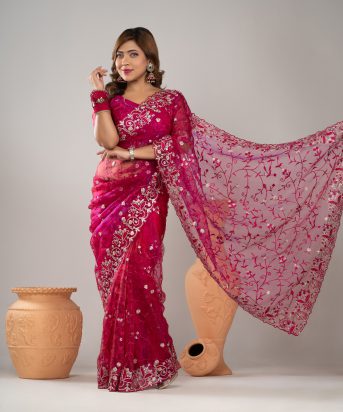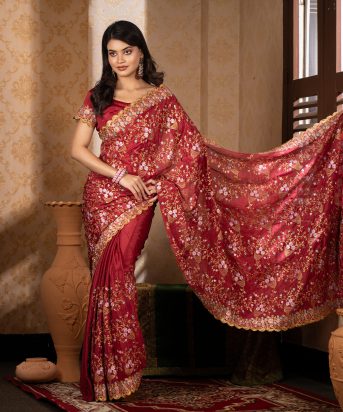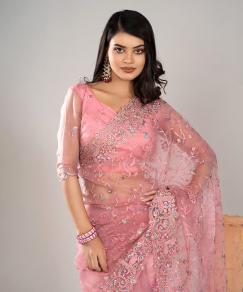 ইমপোর্টেড পিংক কালার ওয়েটলেস সফট জর্জেট ফেব্রিক এর মধ্যে গর্জিয়াস এমব্রয়ডারি কাজ করা পার্টি শাড়ি