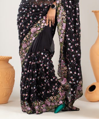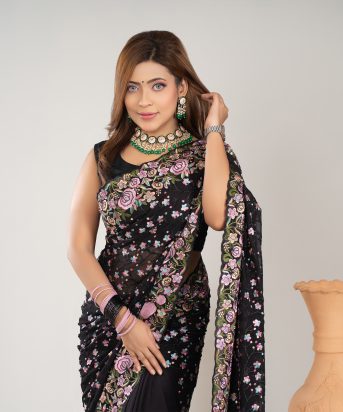 ইমপোর্টেড ব্ল্যাক কালার ওয়েটলেস সফট জর্জেট ফেব্রিকের মধ্যে গর্জিয়াস এমব্রয়ডারি কাজ করা পার্টি শাড়ি