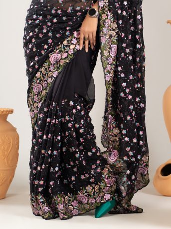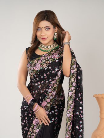 ইমপোর্টেড ব্ল্যাক কালার ওয়েটলেস সফট জর্জেট ফেব্রিকের মধ্যে গর্জিয়াস এমব্রয়ডারি কাজ করা পার্টি শাড়ি