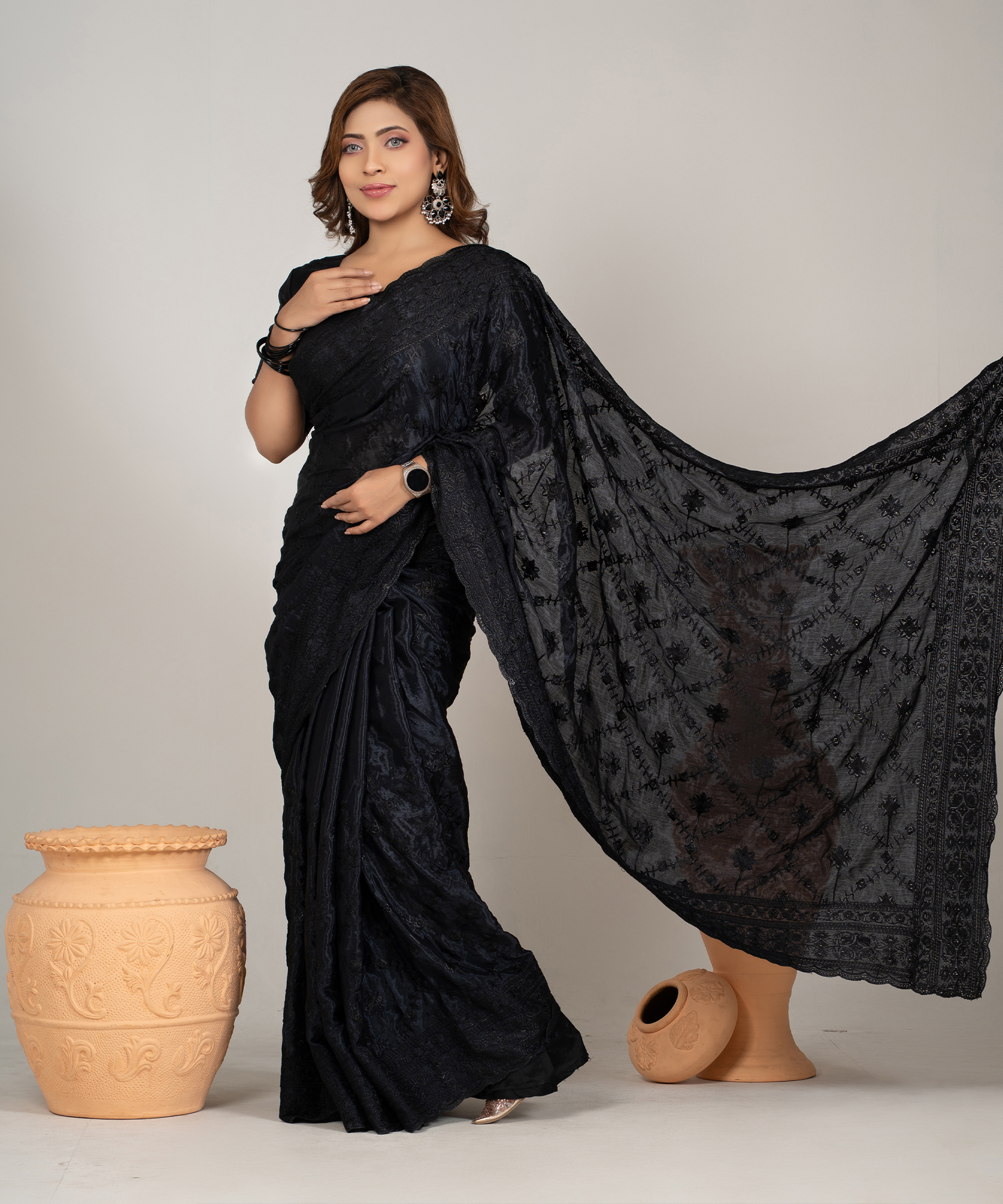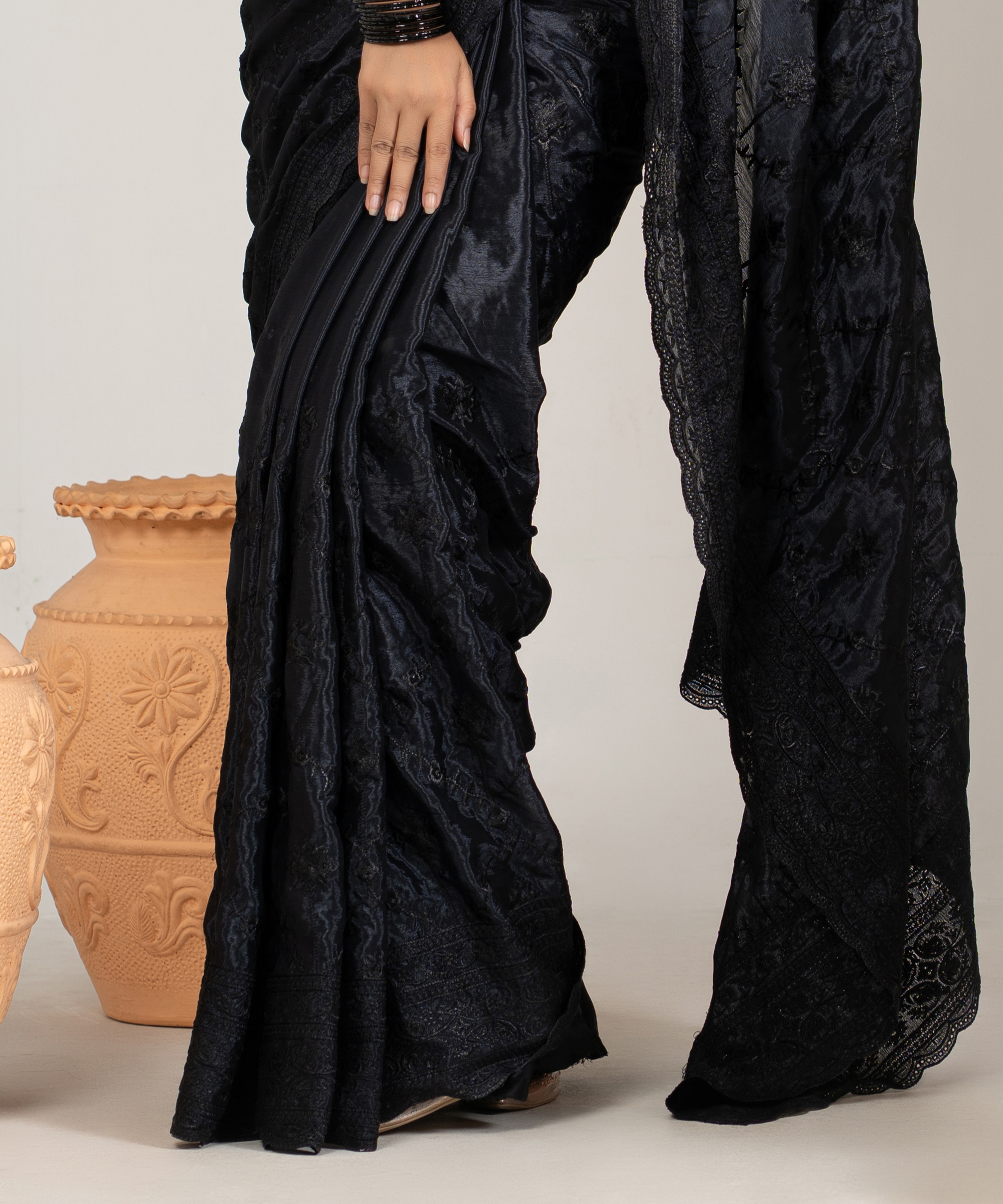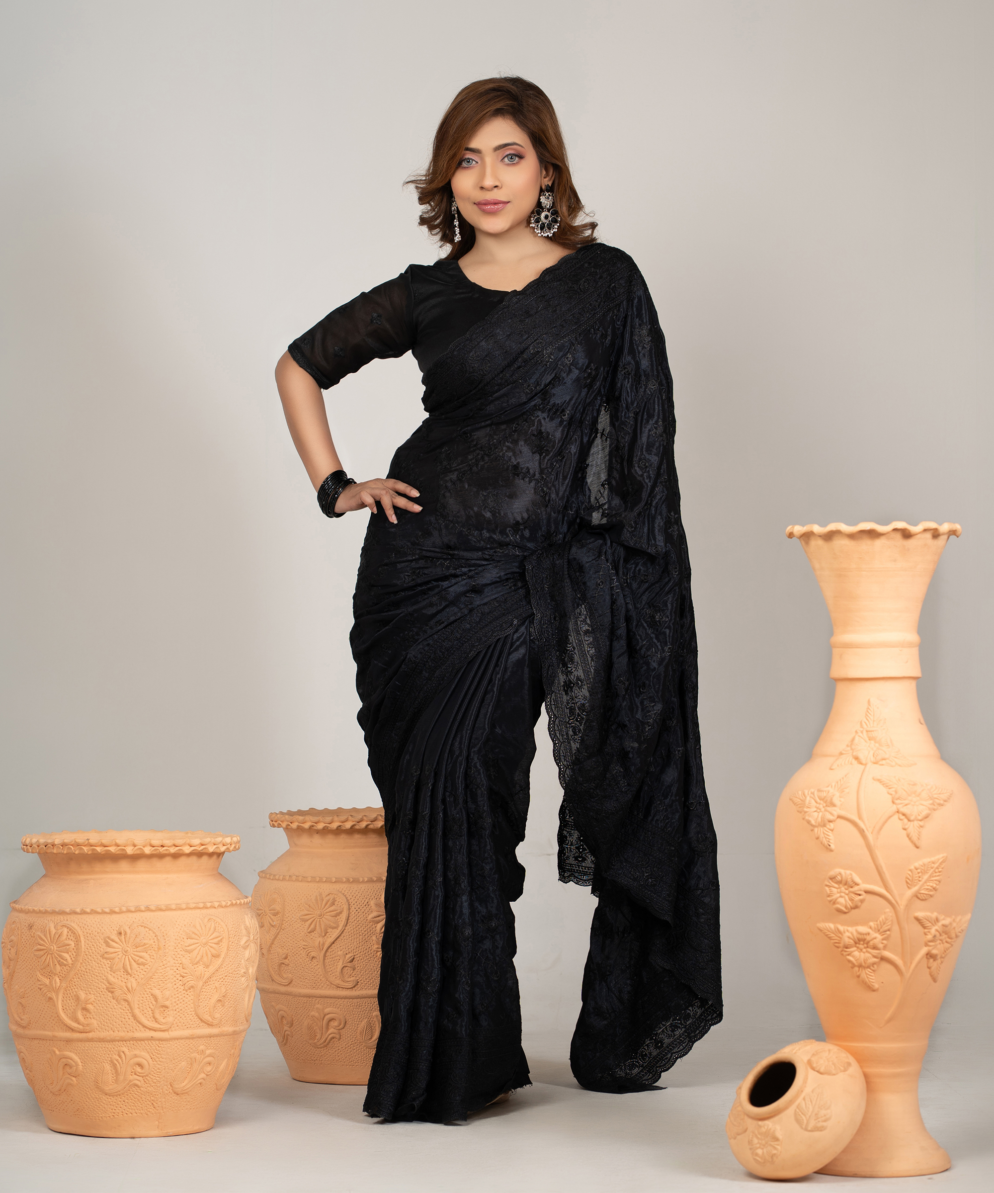 ইমপোর্টেড ব্ল্যাক কালার ওয়েটলেস সফট চিনিগুড়া সিল্ক ফেব্রিক এর মধ্যে গর্জিয়াস এমব্রয়ডারি কাজ করা পার্টি শাড়ি।