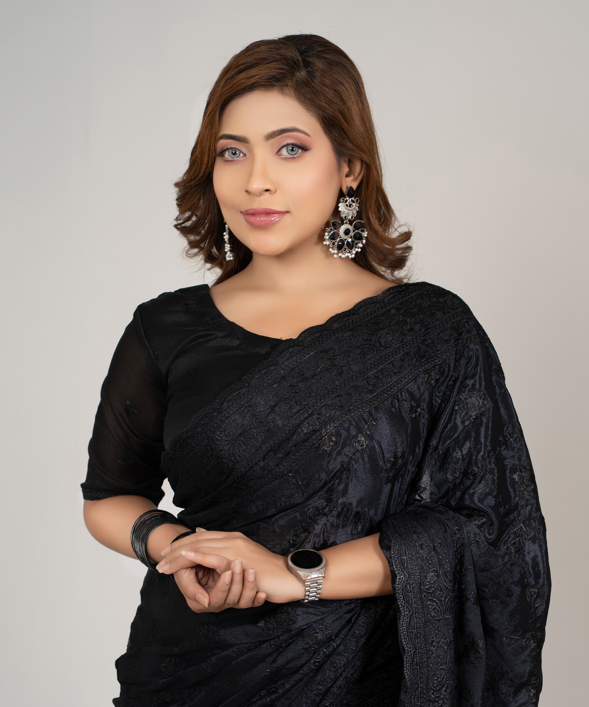 ইমপোর্টেড ওয়েটলেস সফট চিনিগুড়া সিল্ক ফেব্রিক এর মধ্যে গর্জিয়াস এমব্রয়ডারি কাজ করা পার্টি শাড়ি। ফেব্রিকঃ ইমপোর্টেড ওয়েটলেস সফট চিনিগুড়া সিল্ক কালারঃ ব্ল্যাক/কালো ব্লাউজ পিসঃ আনস্টিচ চোষা সিল্ক (গর্জিয়াস এমব্রয়ডারি কাজ করা)