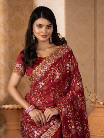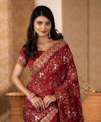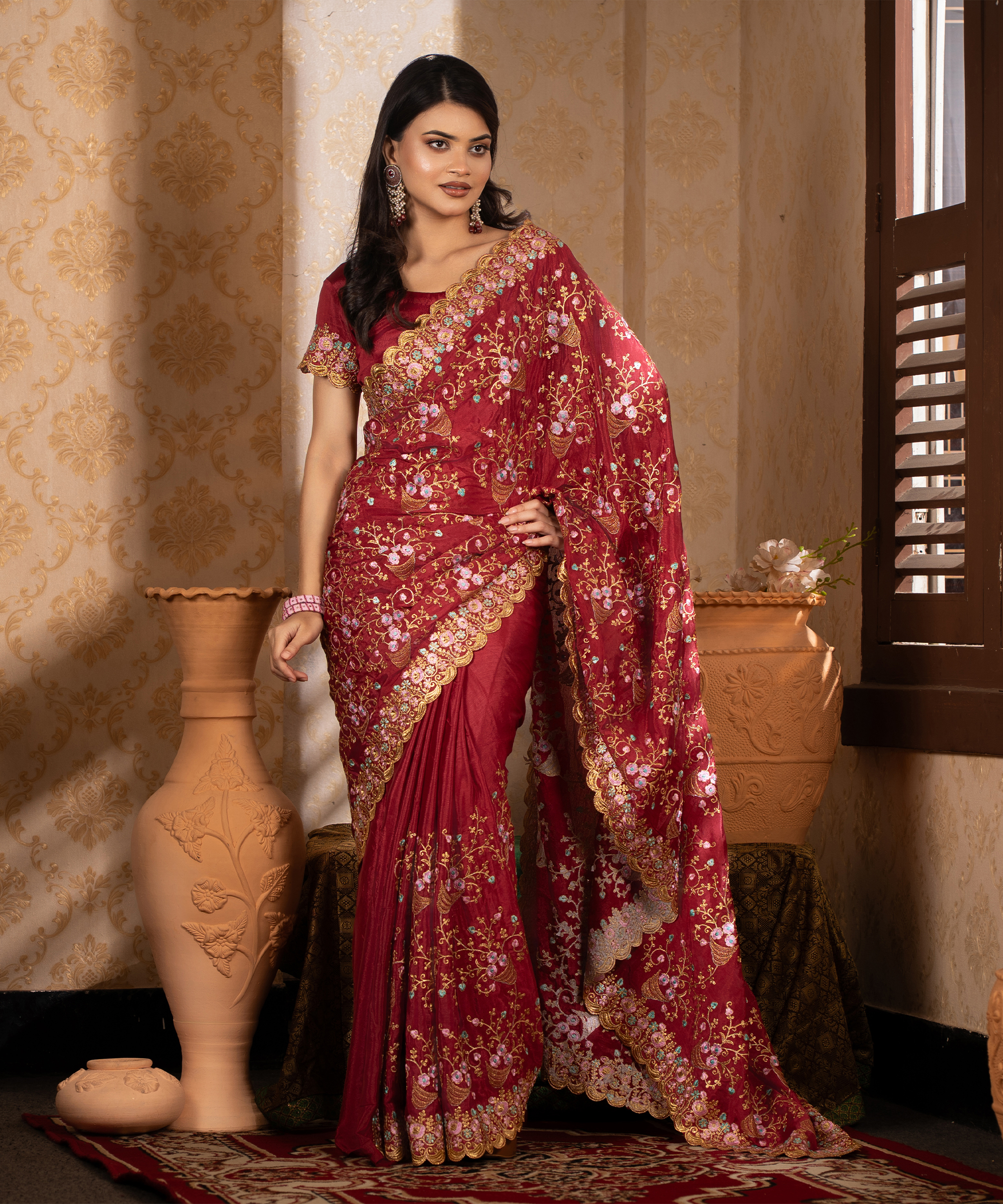 ইমপোর্টেড ওয়েটলেস সফট চিনিগুড়া সিল্ক ফেব্রিক এর মধ্যে গর্জিয়াস এমব্রয়ডারি কাজ করা পার্টি শাড়ি।