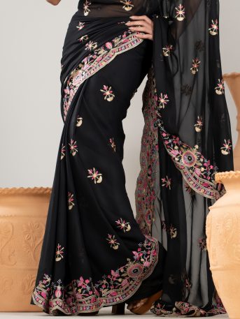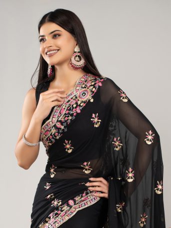 ইমপোর্টেড ব্ল্যাক কালার ওয়েটলেস সফট জর্জেট ফেব্রিক এর মধ্যে গর্জিয়াস এমব্রয়ডারি কাজ করা পার্টি শাড়ি