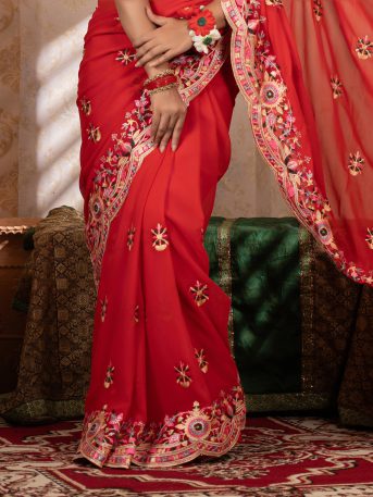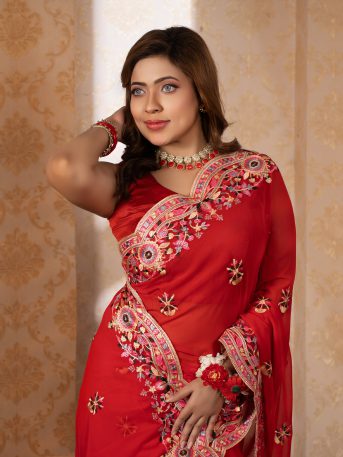 ইমপোর্টেড রেড কালার ওয়েটলেস সফট জর্জেট ফেব্রিক এর মধ্যে গর্জিয়াস এমব্রয়ডারি কাজ করা পার্টি শাড়ি